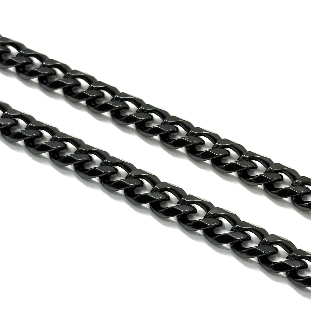 Esta cadena está fabricada en acero quirúrgico 316L con recubrimiento negro aplicado mediante tecnología PVD, lo que garantiza un acabado duradero, resistente y con un brillo elegante.